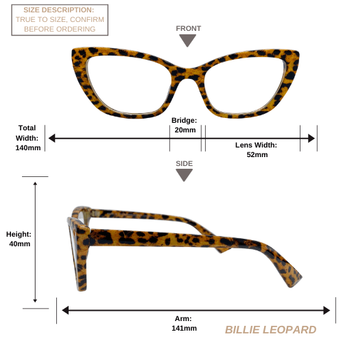 - One Size Fits Most: Total Width: 140mm / Bridge: 20mm / Lens Width: 52mm / Height: 40mm / Arm: 141mm