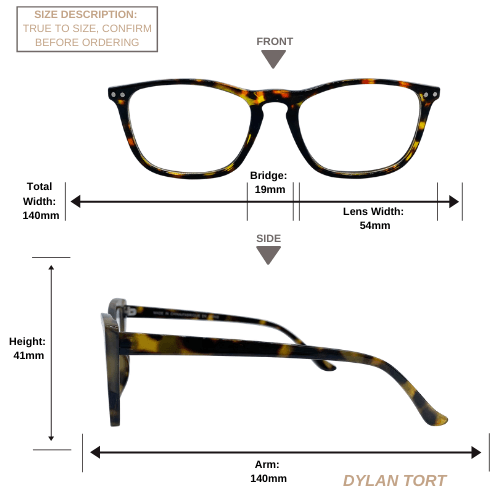 • One Size Fits Most: Total Width: 140mm / Bridge: 19mm / Lens Width: 54mm / Height: 41mm / Arm: 140mm